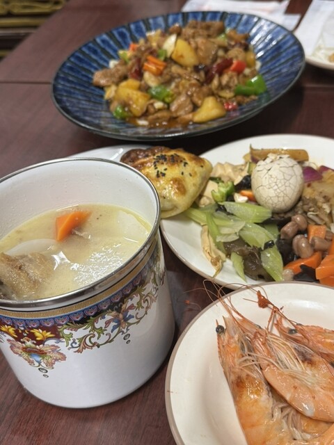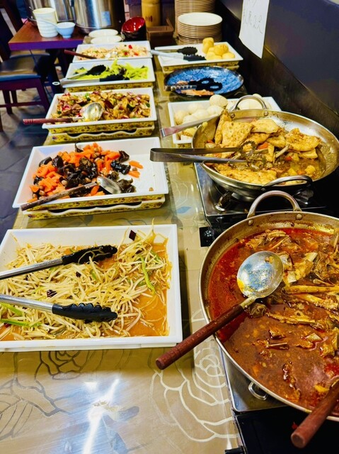 羊の背骨鍋がグツグツと湯気を立て、骨付き羊肉は柔らかく煮込まれ骨から離れ、スープは濃厚でご飯に直接かけたいほど!水煮エビは一尾一尾がぷりぷりで、新鮮なプリプリ食感。麻辣の香ばしい香り~一番のお気に入りは羊スペアリブとジャガイモのナン焼き煮込み。ナンはスープをたっぷり吸い込み、羊スペアリブは香ばしくて臭みなし。一口で神レベル!椒麻鶏の和え物は麻辣がたまらない!冷やし木耳、酸辣ポテト、新疆ピリ辛赤…適当に二杯すくうだけで元が取れる!メニューも定期的に変わるらしい、近くに住む小红薯が羨ましい!