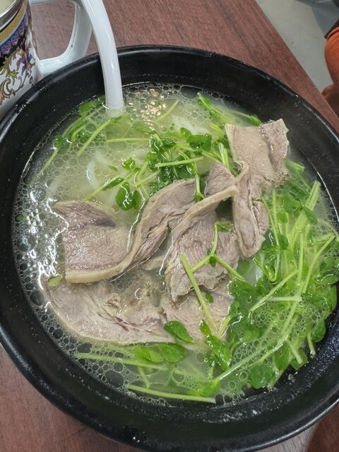 羊スペアリブと羊スープ麺:澄んだスープに薄く浮かぶ脂の膜、豆苗の清らかな香りと柔らかな羊スペアリブ、滑らかな麺を一口吸い込むと病みつきに
