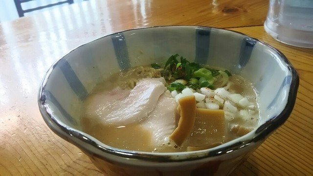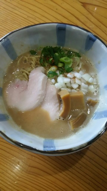 粘度のあるドロッとしたスープにレアチャーシューと刻んだ玉葱で、整った印象。