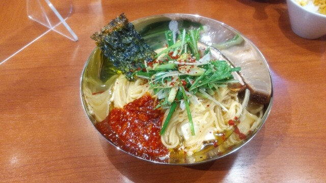 冷やし担々麺(900円)と〆の鶏油飯(150円)。
