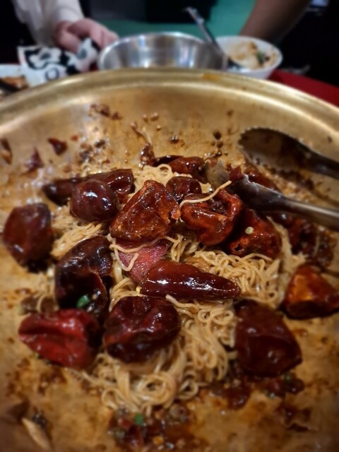 そうこう食べている間に、鍋に包まれた麻辣香鍋が。初めて食べますが、~ん、なんじゃこりゃ~。衝撃的な光景が。とにかく圧倒されました。「大きな唐辛子は辛いので食べないように、唐辛子は端に追いやって食べてくださいと」。3辛を頼みましたが、程よい辛さで、粒山椒(青花椒?)が良く効いています(ちなみに、4辛から追加料金が発生します)。具材で一番人気はエビ団子だったかな。ちなみに、大きな丸い唐辛子は、四川唐辛子と青天麻辣でしょうか。試しに食べてみたのですが、意外と辛くない。ていうか、少し花椒のような香りも。美味しくて、6個ほど食べてしまいました。そして、〆は香港麺を。余った濃厚スープが良く絡み、良いですね。