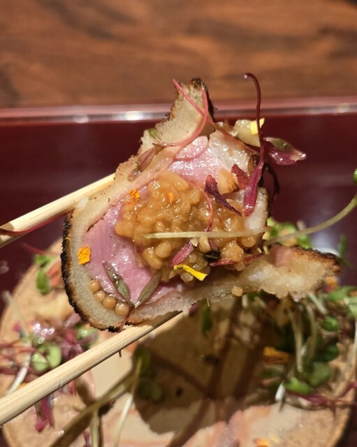 ・炭火で焼いた弾力ある鴨肉を香ばしい食パンで巻いて、ナスタチウムと胡桃のキャラメリゼを乗せた美味しすぎるサンド