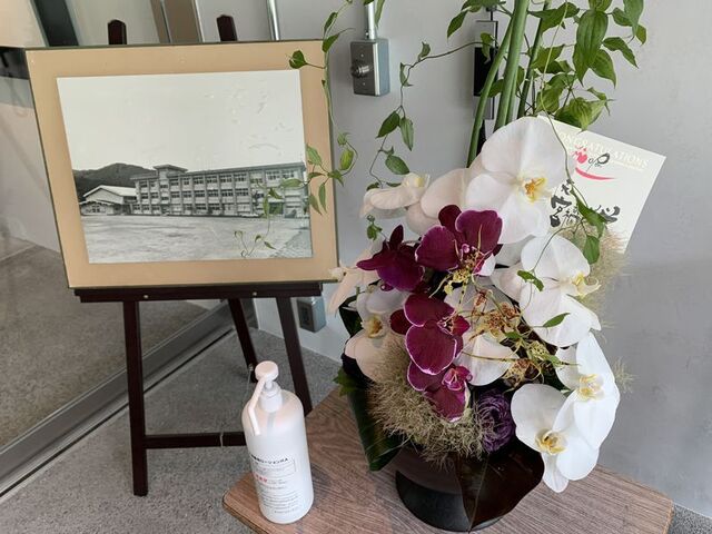 入口には小松市長から贈られた花が飾られていて、中には著名な芸能人や料理人の方からのお祝いの花がたくさん飾られていました。