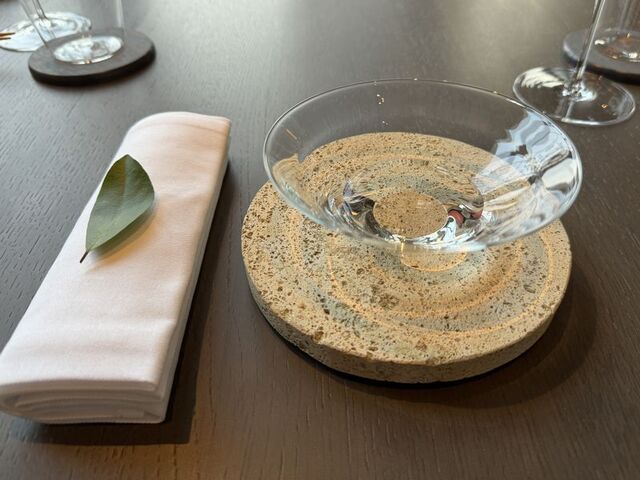ここで突然お椀が出されます。メダイの吸い物。上品なお出汁で和ハーブの1つであるクロモジが使われていました。ここで和のテイストが出されたのが少しサプライズでしたが、シェフの出身が京都であることからかもしれませんね。