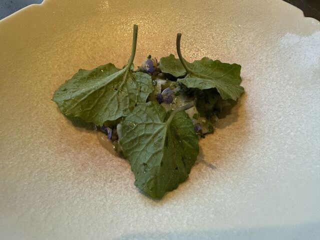 お次は、葉わさびとしても知られセンナの葉の下に隠されている、白バイ貝を山菜の甘草(かんぞう)で和えたもの。白ばい貝の歯ごたえと山菜の苦味を味わう大人の一品。