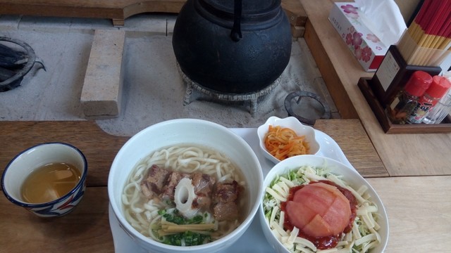 シマスバ(ソーキ乱切り)を注文しようと思っていたが、メニューを見ていると、なぜか急にタコライスが食べたくなって、タコライスセットを注文。
