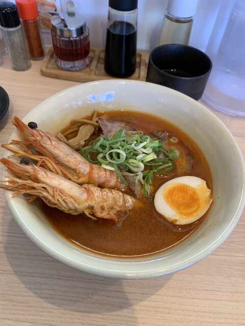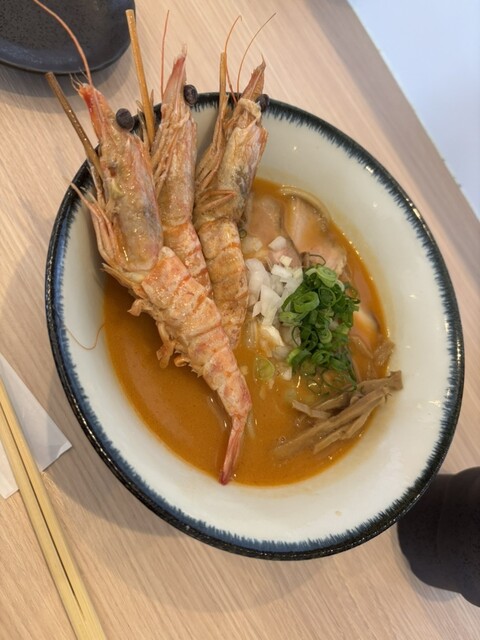 濃厚海老味噌そばは車海老が2尾ものっていて、スープも海老の味が濃く飲み干してしまうほどの美味しさです。