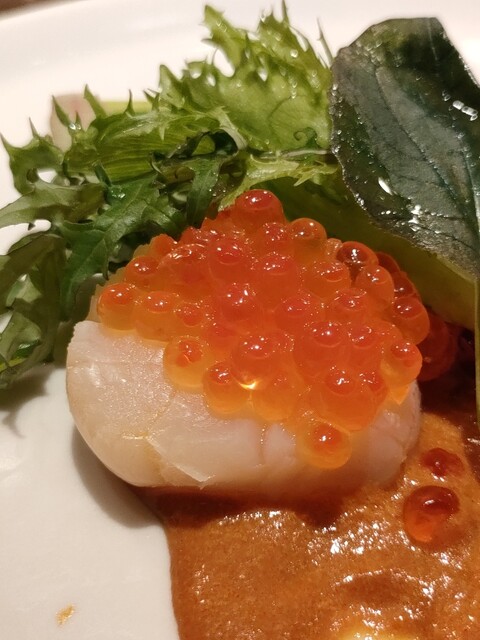 ・鱧ホタテのスフロマート キウイ乗せ 柿のソース