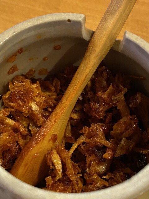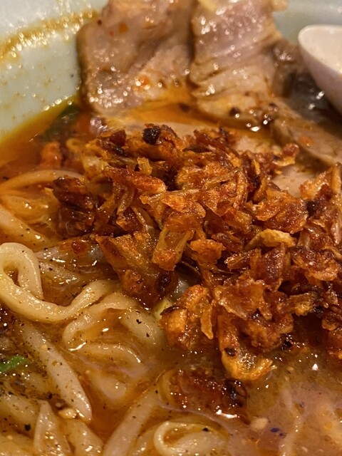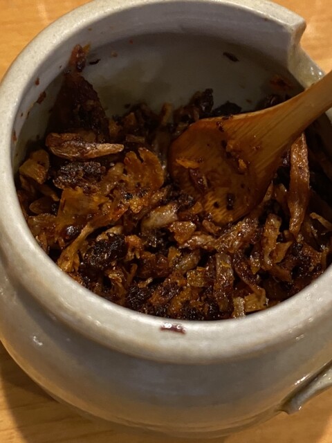 半分食べ進めたところで、カウンター上にある小壺のフライドガーリック&オニオンをトッピングして味変。