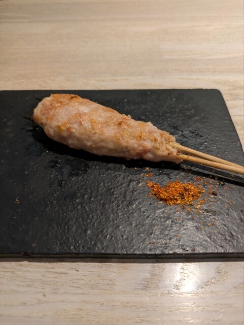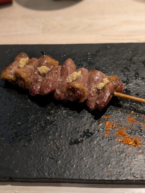 右「つなぎ」と左「ヤゲン軟骨」。「つなぎ」はハツとレバーを繋いでいるもの。ほとんどレバーの味だったので、私はノックアウトでした〜