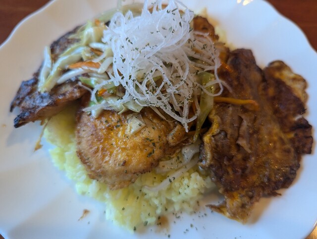 トッピングの中央はササミを揚げたもの、左右は牛肉