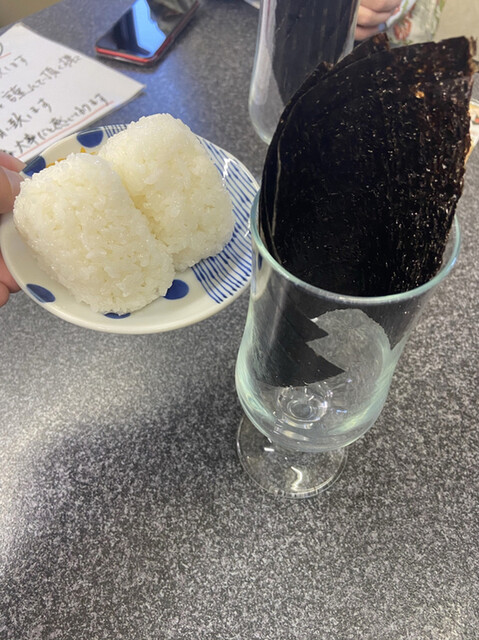 テーブル席に案内され、まずはおにぎりと海苔が到着。海苔は「焼海苔」と「干し海苔」から選べますが、前回同様、香ばしさが好みなので焼き海苔をチョイス。