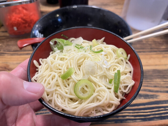 まずはスープから…いつもの塩分強めの豚骨スープがたまりません。そして麺に行く前に大好きなチャーシューをハフハフ食らっていきます。トロトロでしみしみで文句なしの仕上がり。麺は小ネギと胡麻を絡めてズルズル、途中でタイミングを見計らって替玉をコール。「替玉ふつうで!」