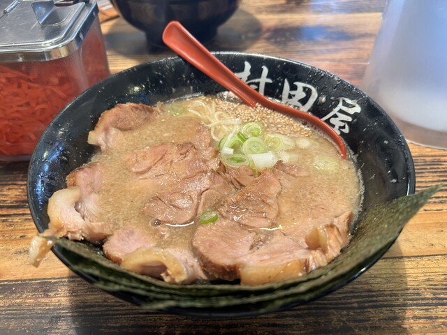 まずは最強のチャーシューから。分厚くてトロトロ、タレがしっかり染みていて思い出すだけでヨダレが出る旨さ!スープはやや塩気強めの濃厚な味わいで、細麺との相性も抜群です。ネギと胡麻が程よいアクセントになっていて、やっぱり村田屋は最強だなと実感します。