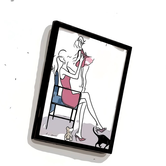 壁に掛かるお母さんが娘を抱きあげる絵は微笑ましい