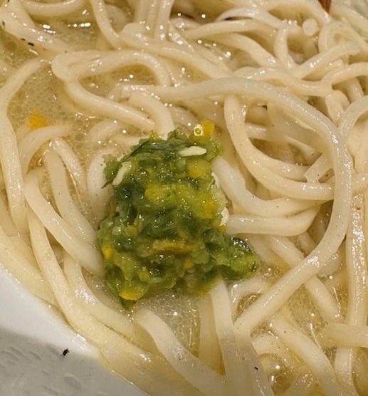 トッピングは、軽く下味をつけた牡蠣、爽やかな柚子の皮、生と揚げの2種の白髪ネギ。