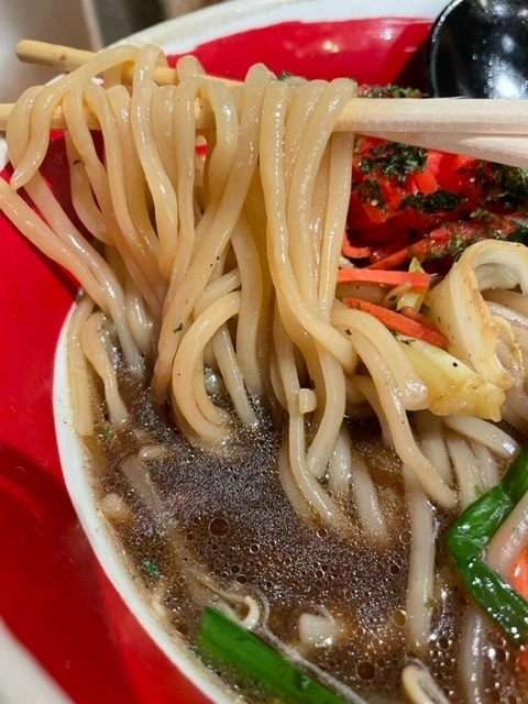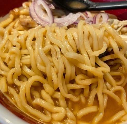 麺は丸麺ではなくて、平打ちっぽいやや太めのやや縮れ麺。