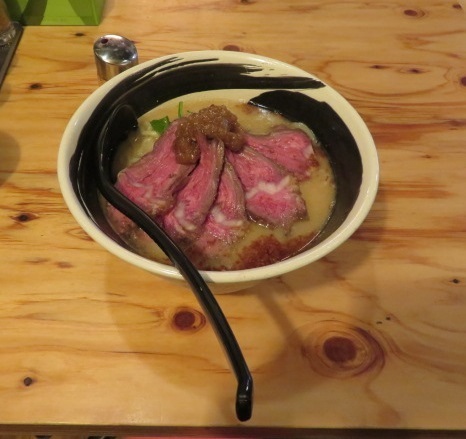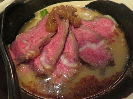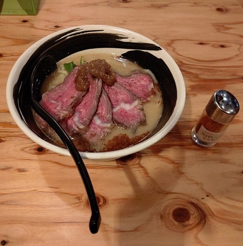 トッピングには、内蔵肉の横隔膜の部位、牛サガリ肉を低温叉焼として、使用しました。柔らかく、ジューシー、とても美味しい出来栄えです。ベビーリーフと、炒め玉葱、ニンニクチップを最後に散らして完成です。