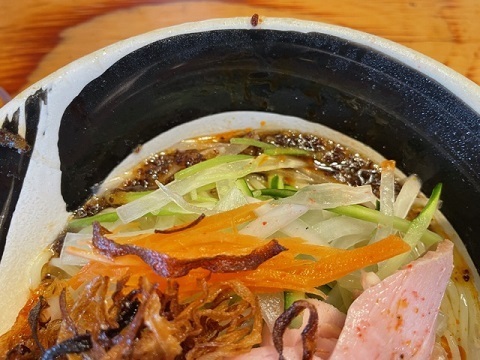 海老を使った塩タレを合わせた鶏ガラスープ。大根に胡瓜に人参、歌に出てきそうな野菜を千切りにたっぷりと乗せて、豚もも叉焼、揚げ玉葱スライスと、2種の油を浮かせるのは、海老で作った醤と、生姜と大蒜を軽めに香りをつけて、コクを乗せるパプリカで色味も◎な油をかけて桜エビ粉を振りかけて、より海老感を演出して、三つ葉を飾り完成です!