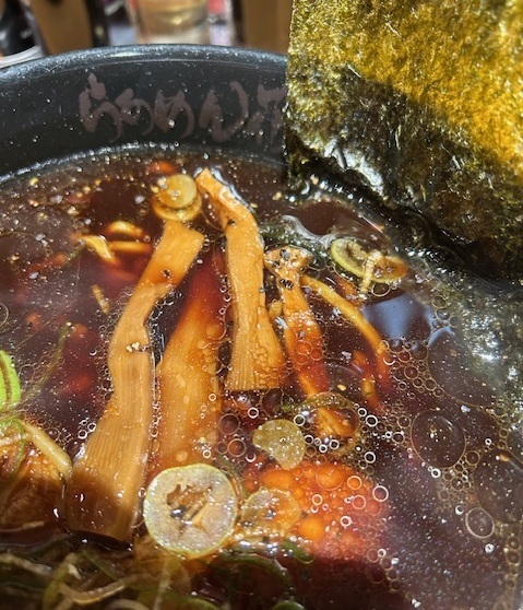 厳選された醤油メーカーのくっきりと際立った醤油の香りと味、オイルとかいろいろな旨味が混じり合った最高のスープですね。
