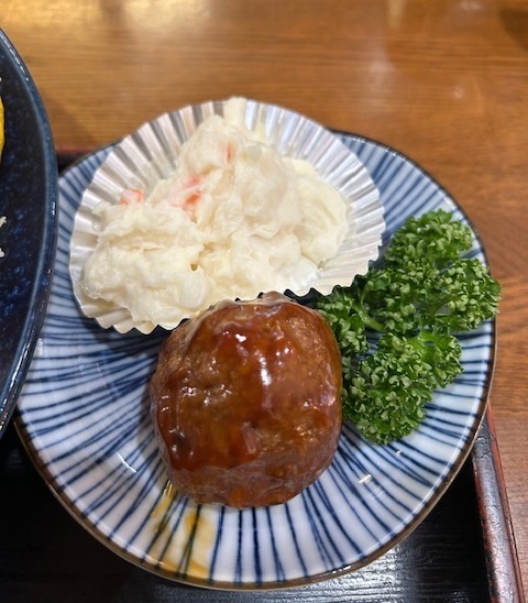 市販と思われるポテサラと大きな肉だんごとパセリ。
