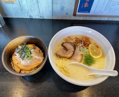 ラーメン・ごはん倉家〜くらいえ@湘南台2022年10月23日(日)。昨日、2022年10月22日オープンのこちらを訪問しました。倉家ラーメンシェアカフェ長後食堂からの移転です。行きたいな~と思いながら、月曜のみの営業でハードルが高く未訪問ですが、評判がよかったので!ヒンア53'sヌードル→ShonanCraftNoodle結の跡地です。前者は開店時に訪問しましたが、多忙中でレポはしていません(;^_^A後者はすみません、未訪問でした。53'sNoodleのたっちゃんは、ブロガー仲間でよくいっしょにラーメンを食べていましたが、立派な有名店の店主さんになられました☆彡上の看板は53'sNoodleのままでした。スタッフさんに店内に促されて入店しました。お祝いのお花。券売機。こちらにもお花。いろいろ置いてありました。こちらにもお祝いが。荷物入れ、キュートです。卓上。お水のコップ。メニュー。先客様は5名。厨房に向かったカウンター席6席。うしろの窓際にカウンター席4席で計10席。女性店主さん、ベテラン風味の男性スタッフ、若い女性スタッフの3名体制。とても丁寧な接客です。鶏白湯ラーメン 850円。麺カタメわー、とても綺麗!スープはまろやかでとても美味しい鶏白湯!ややライトなカンジですが、牛乳ラーメンを彷彿とさせる洋風のめっちゃ美味しいスープ!太めのストレート麺もコシがあって、スープと絡んでめっちゃうま!炙りチャーシュー丼 350円。並べてミタ。最初はそのままで、あとからを絞ってお召し上がりくださいと。白ネギ、青ネギ、焦がしネギ、丁寧なあしらいでいいカンジ。スープに焦がしネギを混ぜるとワイルドになって、めっちゃ美味しい味変に!チャーシューは味もよく、食感がべリーグ—!青ネギ・白ネギ・刻み海苔・白ゴマが入った炙りチャーシュー丼もめっちゃうま!ごはんも美味しいし、ご飯の量はきっちり秤で計っているようでしたが大食いで亡くなった私にはちょうどよさげな量でした。ご馳走様でした。でもお腹いっぱい!すぐにお腹いたくなったし、夜は軽めになりました(笑)後客様は8名で繁盛してました。ちなみに店主さんとスタッフさんのお話の中では、新しい看板に明日変わるらしいということでした。本当に美味しかったので前メニュー制覇したいです!ラーメンデータベース