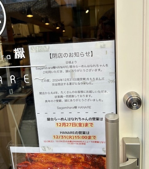 2024年12月31日(昼営業)をもって、Sagamihara欅 HANARE/屋台ラーメン はなれちゃん(12月27日まで)を閉店する運びとなったようです。