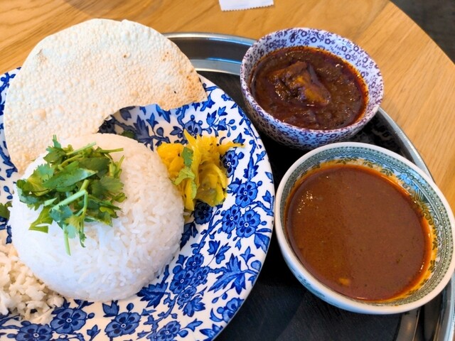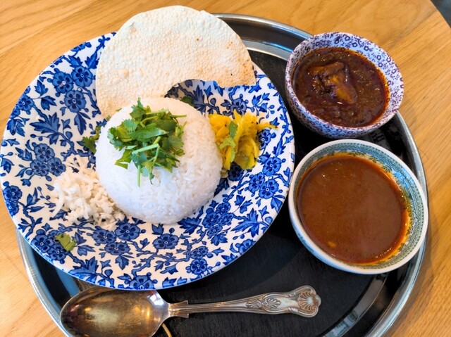 ギー(エビ、辛さ中辛、ごはんS)、2種セット(チキン&ポーク、辛さちょい辛、ごはんM)にしました★パクチーの有無を聞かれたので、なしとあり1つずつに。