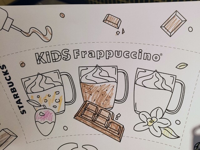 また塗り絵もあったので、窓口注文のフラペができるまで暇つぶしに子どもがぬりぬり。これは店頭で売られていたタンブラーにセットすればオリジナルのタンブラーとして使えるなど工夫も。