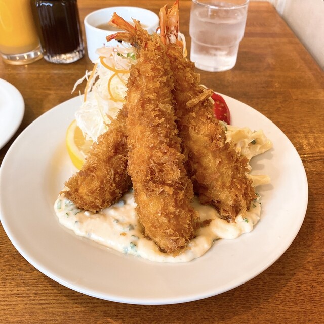 肉厚で大ぶりのエビフライが3尾、サラダ、コンソメスープはいずれも良品。