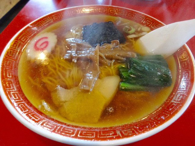 ラーメンは醤油味のスープでチャーシュー、ナルト、シナチク、海苔、ほうれん草が乗ったまさにザ・昭和のラーメン。ムチャクチャ懐かしいテイストでした。