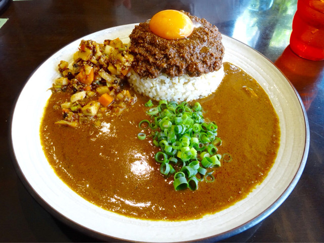 まずキーマとご飯とルーで一口。キーマは味噌が効いている濃厚な挽肉でルーとよく合います。カレールーはほんのりカツオが香り甘さの後に辛さが来る絶妙のおいしさです。和風でも欧風でもインド風でもない独特な極上の風味。これ凄いなあ。