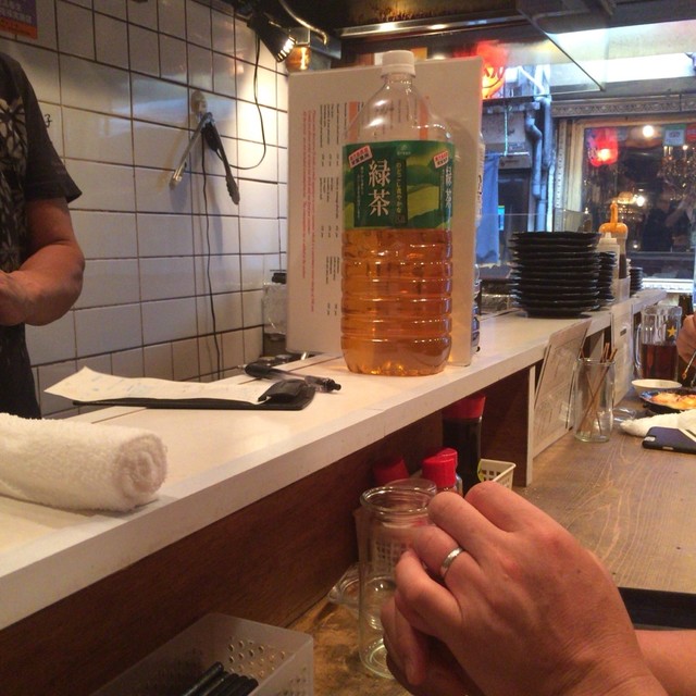 土曜日午後5時の新宿西口思い出横丁、狭い路地は人でごった返してます。数あるお店から予め調べていたこちらに着くとまだ辛うじて奥のカウンター席が空いていました。