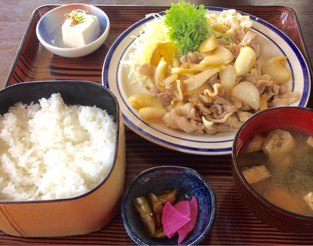出てきた料理は良く炒められた肉と玉ねぎとキャベツが山盛り。ご飯半分と言っても一合弱くらい。これに冷奴とお新香と味噌汁が付くんですからかなりのボリュームです。