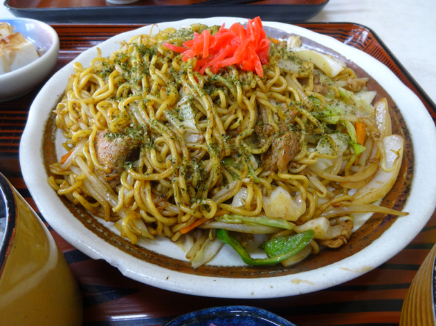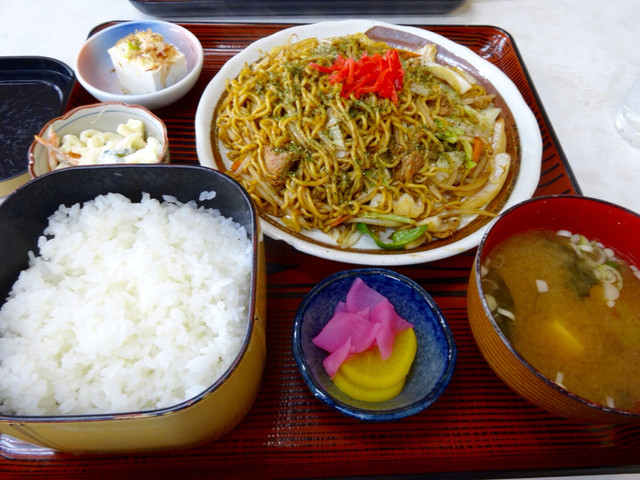 焼きそばは野菜も肉もタップリの具沢山で濃いめのソースで味付けされ、十分「おかず」になるおいしい一品。そして半ライスは例によって一合近くある盛の良さ、これにお新香・味噌汁・冷奴・マカロニサラダが付くボリューム満点のセットです。濃いめのソース焼きそばと白米を一緒に食べるともう至福ですよ。
