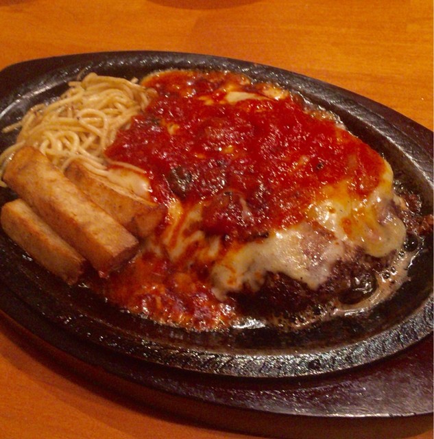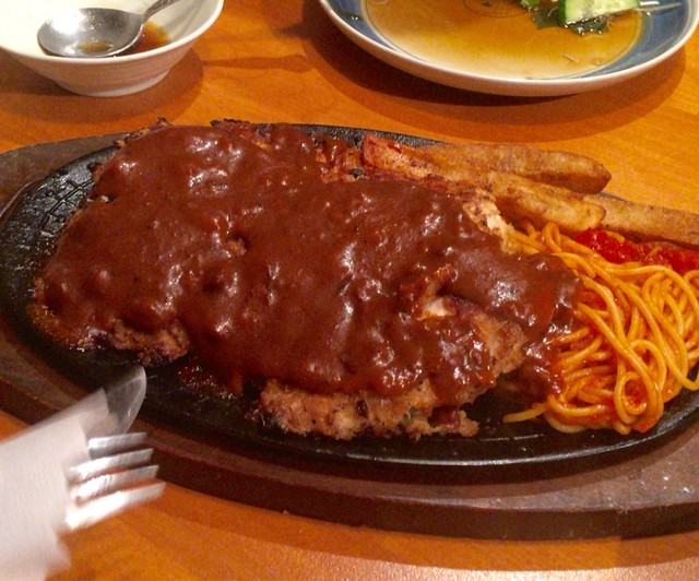 次がチキンカツデミグラスソース、これがデカいんだ。よくある一人用の鉄板からはみ出す勢いの大きさでチキンも柔らか、1200円も納得の一品。