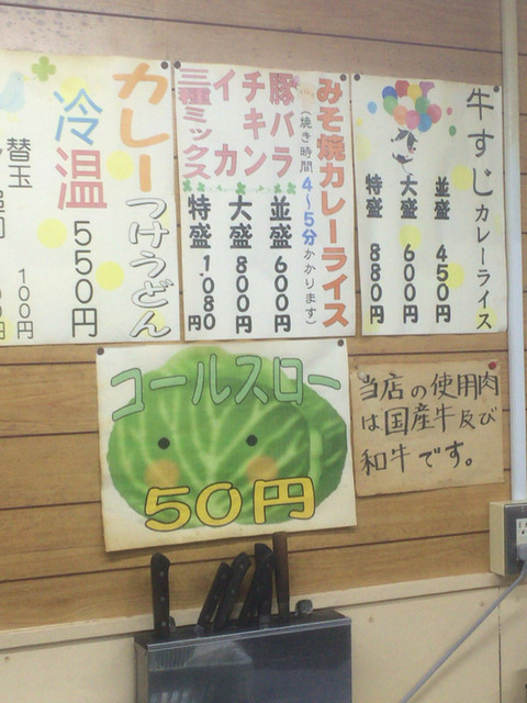 待つこと7分、カウンターのみの狭い店内に入りました。私はカレーの大盛とコールスロー、連れはカレーの並を注文。