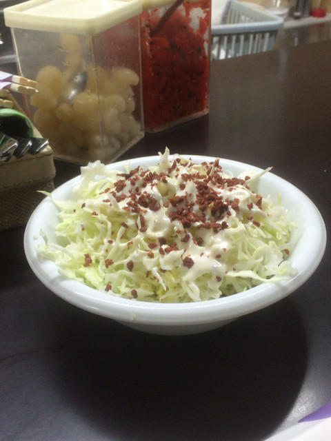 まず出て来たコールスロー、確かにキャベツだけだけどちゃんとベーコンチップもかかっててこれでホントに50円でいいの?っていう驚きの一品。