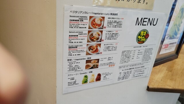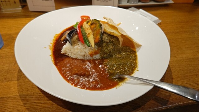 マトンブラウン、チキン、若草、マイルドの四種のカレーが楽しめて、野菜も9種類がトッピングされている豪華カレーです