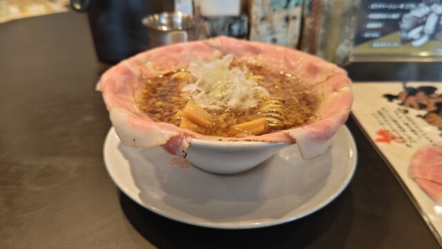 おお、美しい大きなチャーシューが襟巻きの如くに丼を取り巻いています。