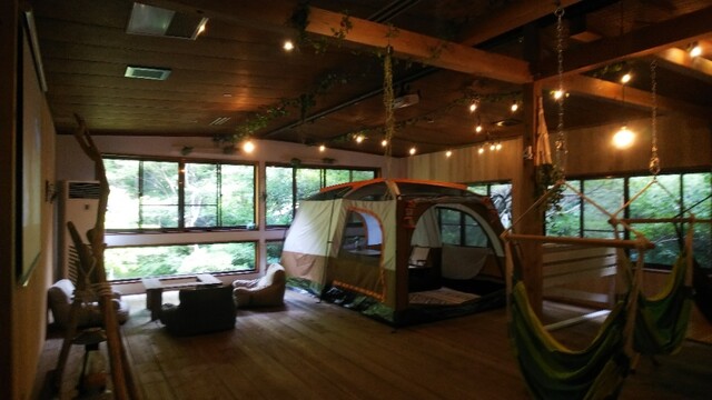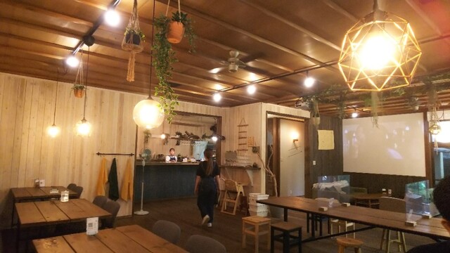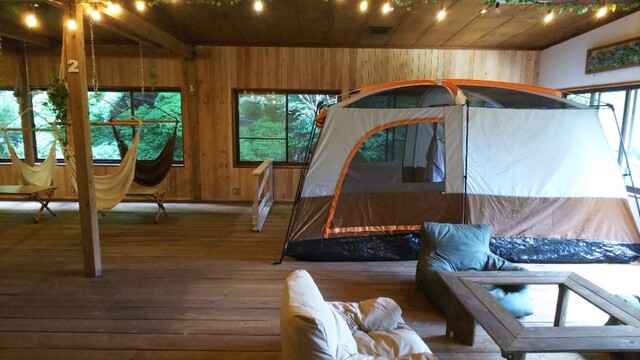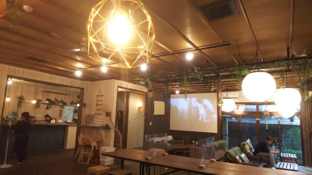 スペースが大きく分けて3分類になっていて、店内1階はテーブル、ソファ中心のカフェスタイル、2階はキャンプ場スタイルのハンモック席のあるアダルトなスペース、そして建物外の緑に包まれたスペースはwith dogsで楽しめる空間になっています。
