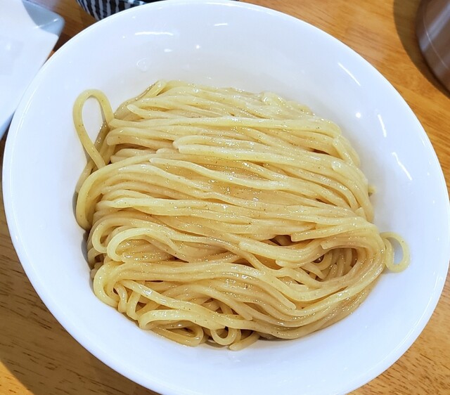 麺は中平打ち麺。麺肌がとても滑らかで口当たりが良い。少し柔めな茹で加減でそれが織り成す独特な食感が堪らなく良い。つけダレに浸けず柚子胡椒のみで食べても充分に旨い。