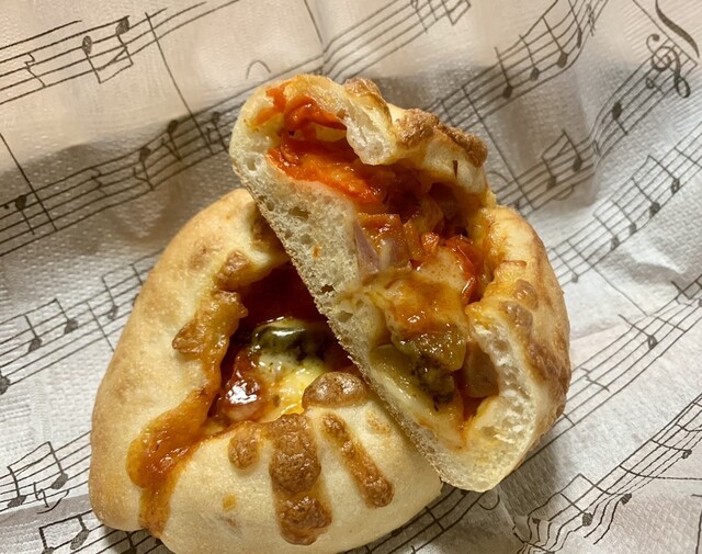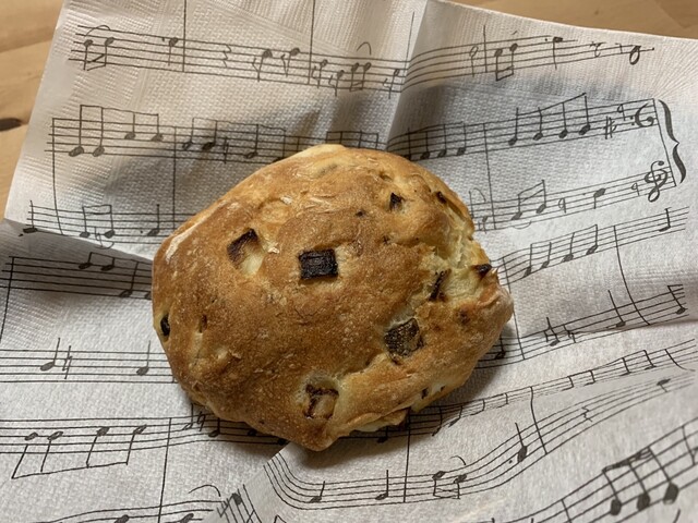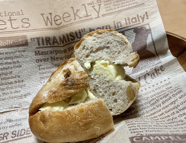 薄くパリッとした皮はハードな食感で歯ごたえがあり、大小ふぞろいな気泡のクラムは見た目は意外と詰まっているが、しっかりと弾力の中あるハードな食感でよき(^^)