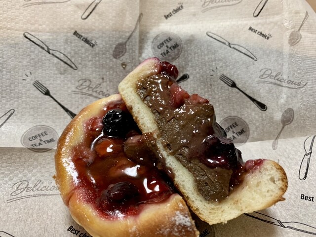 たっぷりの自家製チョコカスタードとミックスベリーを使用したスイーツパン。
