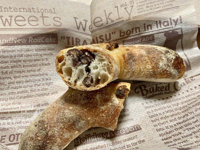 エスプレッソ入りのハード生地に、チョコ、マロングラッセ、ヘーゼルナッツを練り込んだパン。