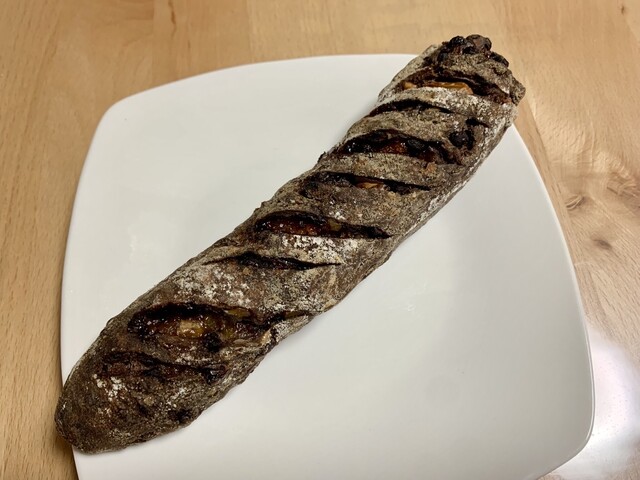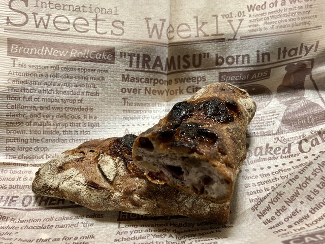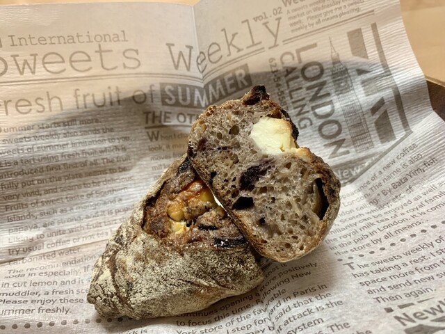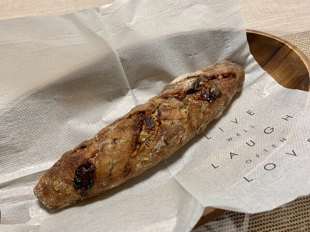 クラストがパリッとしたハードな食感で美味しいのは言うまでもなく、セミドライバナナはほどよい甘味が感じられ、ドライフルーツなのに新鮮なねっとりとした食感もあり、クルミのザクザク感との対比が良い^ - ^