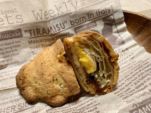 ザクザクとサクサクが共存するたまらない食感の生地の中に、自家製カスタードクリームとチョコレート、マンゴークリームを加えたダマンド。