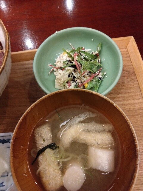 かつお丼をいただきました。小鉢1品とお味噌汁とお漬物がついてます。
