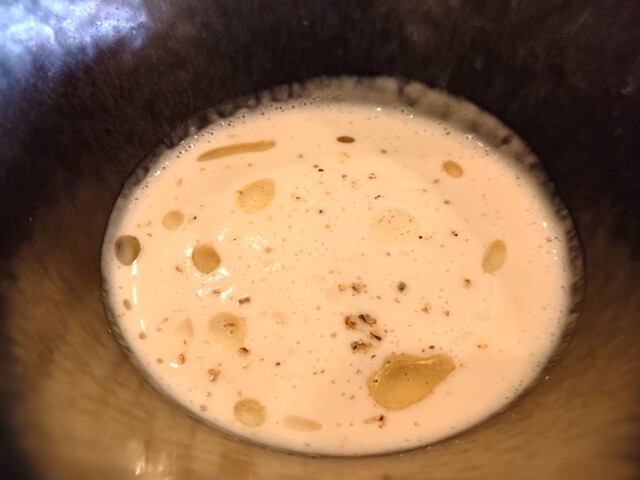 季節野菜のプルーテ∶カリフラワーのポタージュ(豚から取れたオイルをスモークしたものがかけてある)