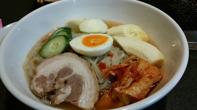冷麺。なぜかバナナが。旦那好みの薄味。私は酢を多めに入れて♪